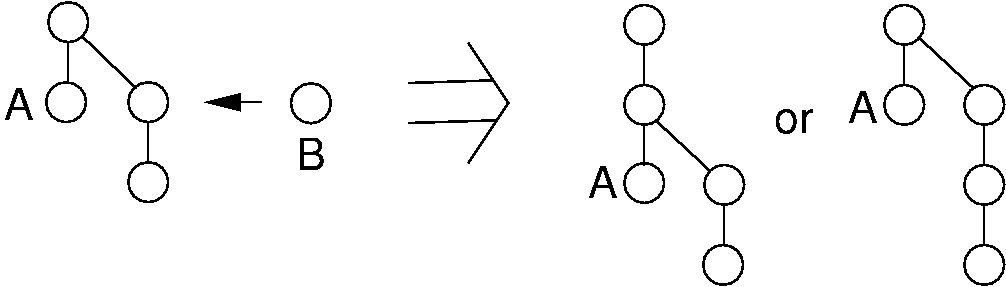 Figure 7.4.1 illustrates a different organization for the comparisons that we might do. First we compare the first and second element, and the third and fourth elements. The two winners are then compared, yielding a binomial tree. We can view this as a (sorted) chain of three elements, with element \(A\) hanging off from the root. If we then insert element \(B\) into the sorted chain of three elements, we will end up with one of the two posets shown on the right side of Figure 7.4.1, at a cost of 2 comparisons. We can then merge \(A\) into the chain, for a cost of two comparisons (because we already know that it is smaller then either one or two elements, we are actually merging it into a list of two or three elements). Thus, the total number of comparisons needed to sort the five elements is at most seven instead of eight.