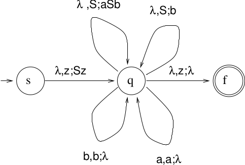 symbolis the lookahead symbol and $ is the end-of-string marker:state = s push(S) state = q read(symbol) obtain the lookahead symbol while top-of-stack <> z do while stack is not empty case top-of-stack of S: if symbol == a then cases for variables { pop(); push(aSb) } replace S by aSb else if symbol == b then { pop(); push(b) } replace S by b else error a: if symbol <> a, then error cases for terminals else { pop(); read(symbol) } pop a, get next lookahead b: if symbol <> b, then error else { pop(); read(symbol) } pop b, get next lookahead end case end while pop() pop z from the stack if symbol <> $ then error state = f