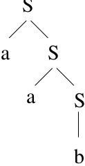 \[\begin{split}\begin{array}{lccccccccc} &&&&a \\ &&a&&S &S &B & b\\ &&S& S& c& c& c& c & c \\ \mbox{Stack:} & \underline{S} & \underline{c} & \underline{c} & \underline{c} & \underline{c} & \underline{c} & \underline{c} & \underline{c} & \underline{c} \\ \mbox{symbol:} & a & a & a' & a' & b & b& b& c & c' \\ \end{array}\end{split}\]where \(a'\) is the second \(a\) in the string and